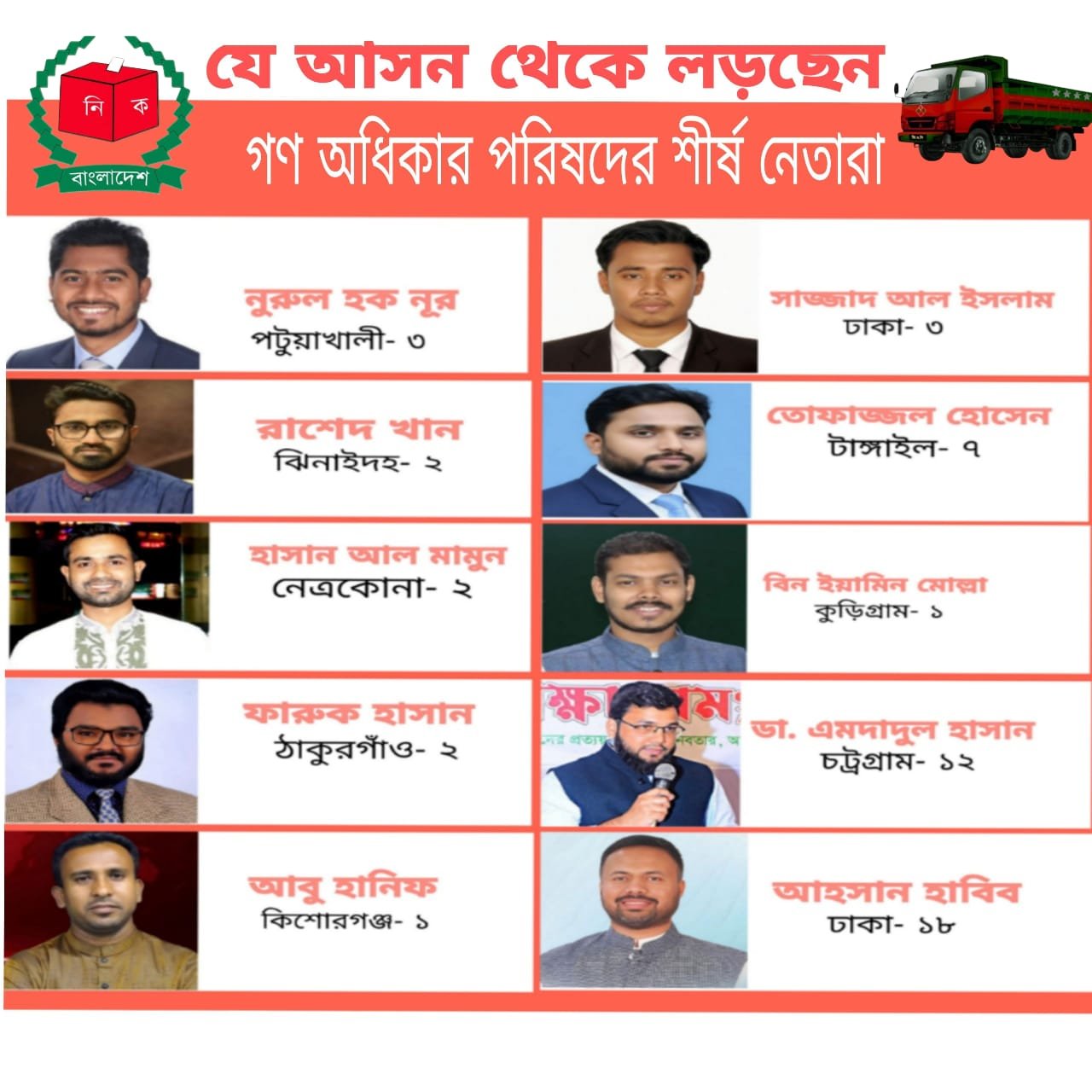 নূরুল হক নূর (পটুয়াখালী-৩), রাশেদ খান (ঝিনাইদহ-২) ও ফারুক হাসান (ঠাকুরগাঁও-২) — এই তিন নেতার নির্বাচনি এলাকায় জনতার উৎসাহ যেন এক নতুন রাজনৈতিক বার্তা দিচ্ছে। স্থানীয়দের মতে, “নূর, রাশেদ আর ফারুক মানেই সাহস, সততা আর পরিবর্তনের প্রতীক।”