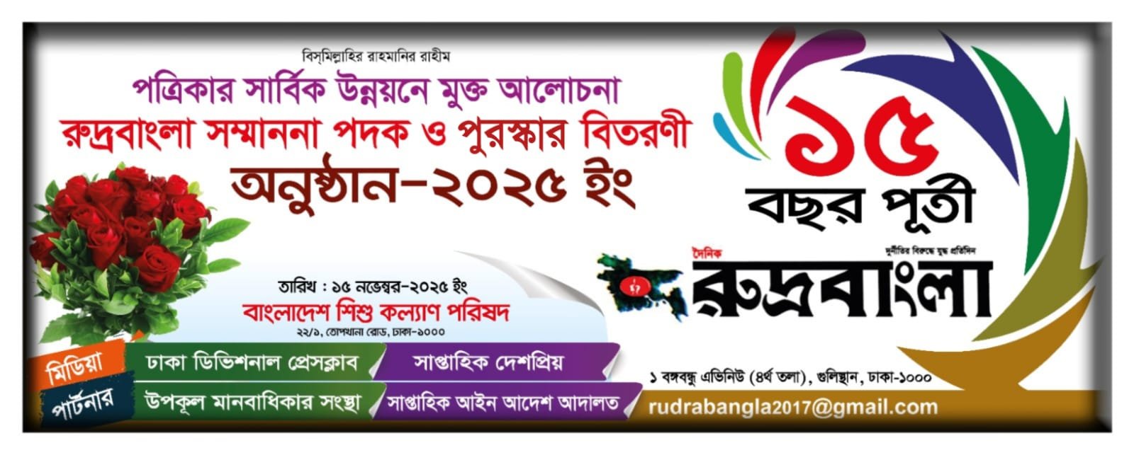 পত্রিকার সার্বিক উন্নয়ন এবং সাংবাদিকতায় অবদান রাখা ব্যক্তিত্বদের সম্মাননা জানাতে আগামীকাল শনিবার, ১৫ নভেম্বর ২০২৫ বিকাল দুইটায় রুদ্র বাংলা সম্মাননা পদক ও পুরস্কার বিতরণী অনুষ্ঠান অনুষ্ঠিত হবে। বাংলাদেশ শিশু কল্যাণ পরিষদের ২২/১ সেগুনবাগিচা রোড, ঢাকা ১০০০ ঠিকানায় এই অনুষ্ঠান আয়োজন করা হয়েছে।