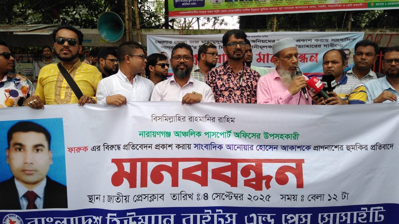 দৈনিক স্বাধীন সংবাদ পত্রিকার সম্পাদক ও প্রকাশক মোঃ আনোয়ার হোসেন আকাশের প্রাণনাশের হুমকি প্রদানকারী নারায়ণগঞ্জ জেলা পাসপোর্ট অফিসের উপসহকারী দুর্নীতিবাজ সাবেক ছাত্রলীগ নেতা ফারুক আহমেদকে আগামী ২৪ ঘণ্টার মধ্যে প্রত্যাহার ও সাংবাদিক সাগর চৌধুরির মিথ্যা মামলা প্রত্যাহারের দাবিতে আজ, ১০ সেপ্টেম্বর ২০২৫, বুধবার, জাতীয় প্রেসক্লাবের সামনে বাংলাদেশ হিউম্যান রাইটস এন্ড প্রেস সোসাইটির মানববন্ধন অনুষ্ঠিত হয়।